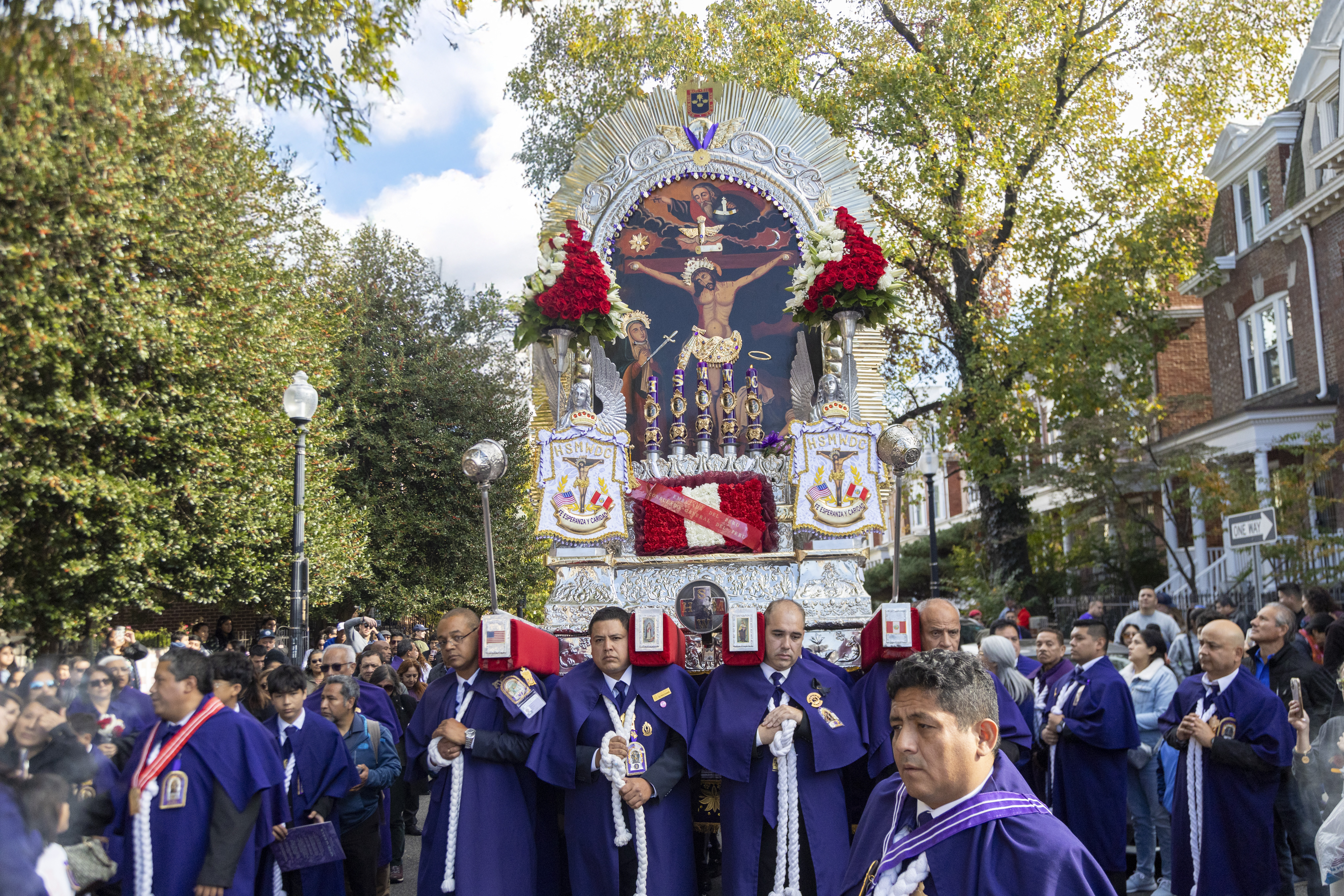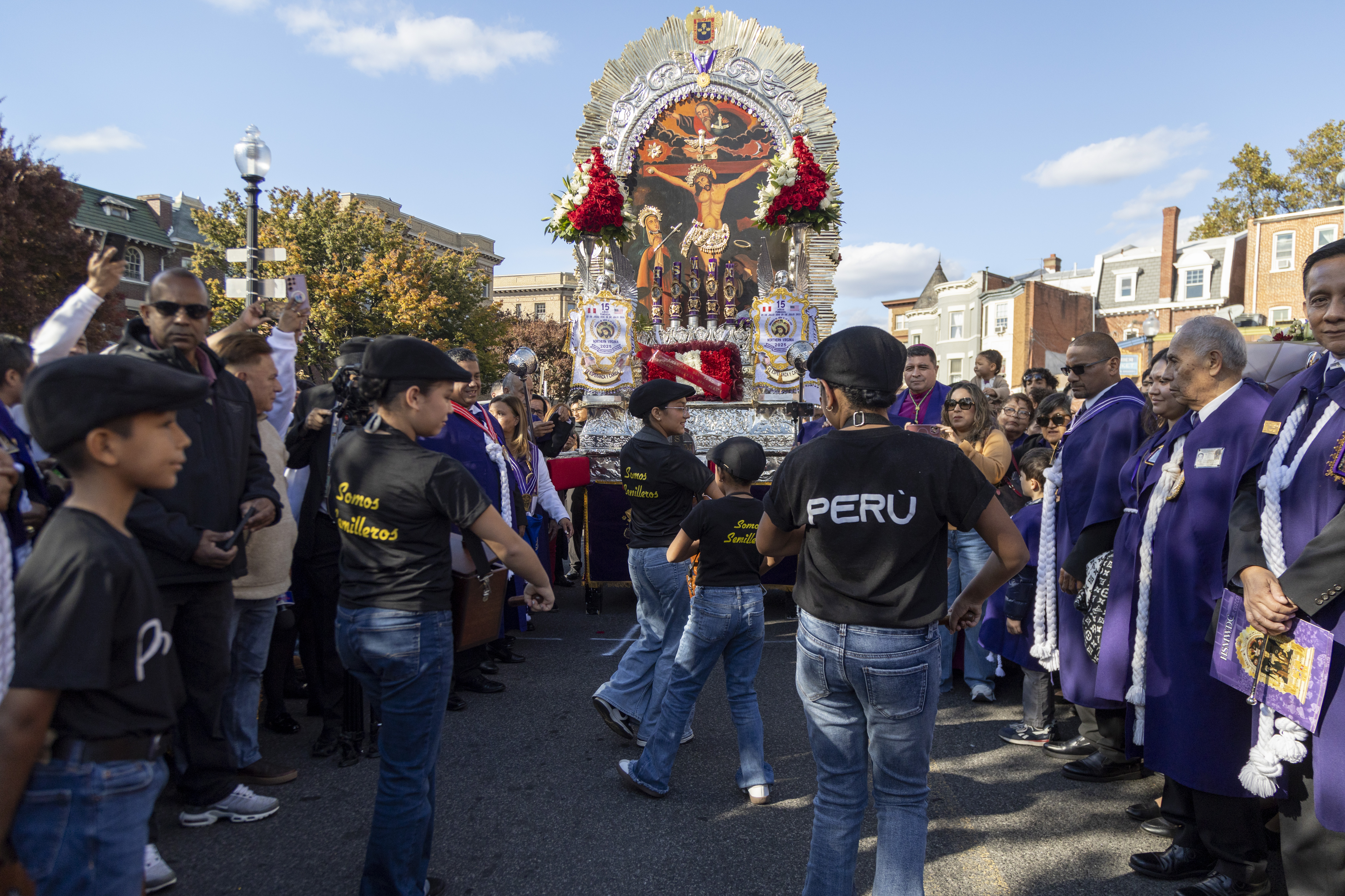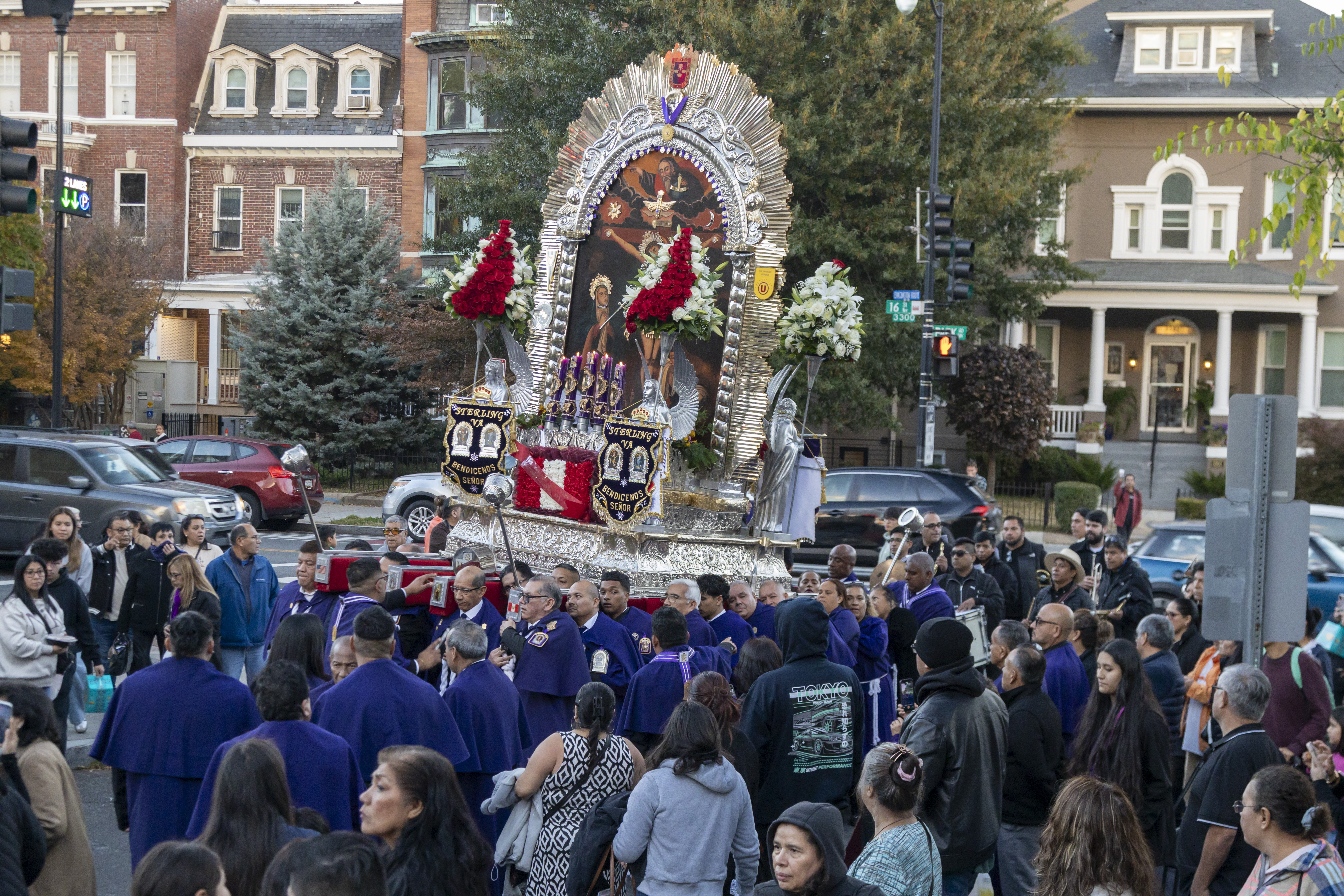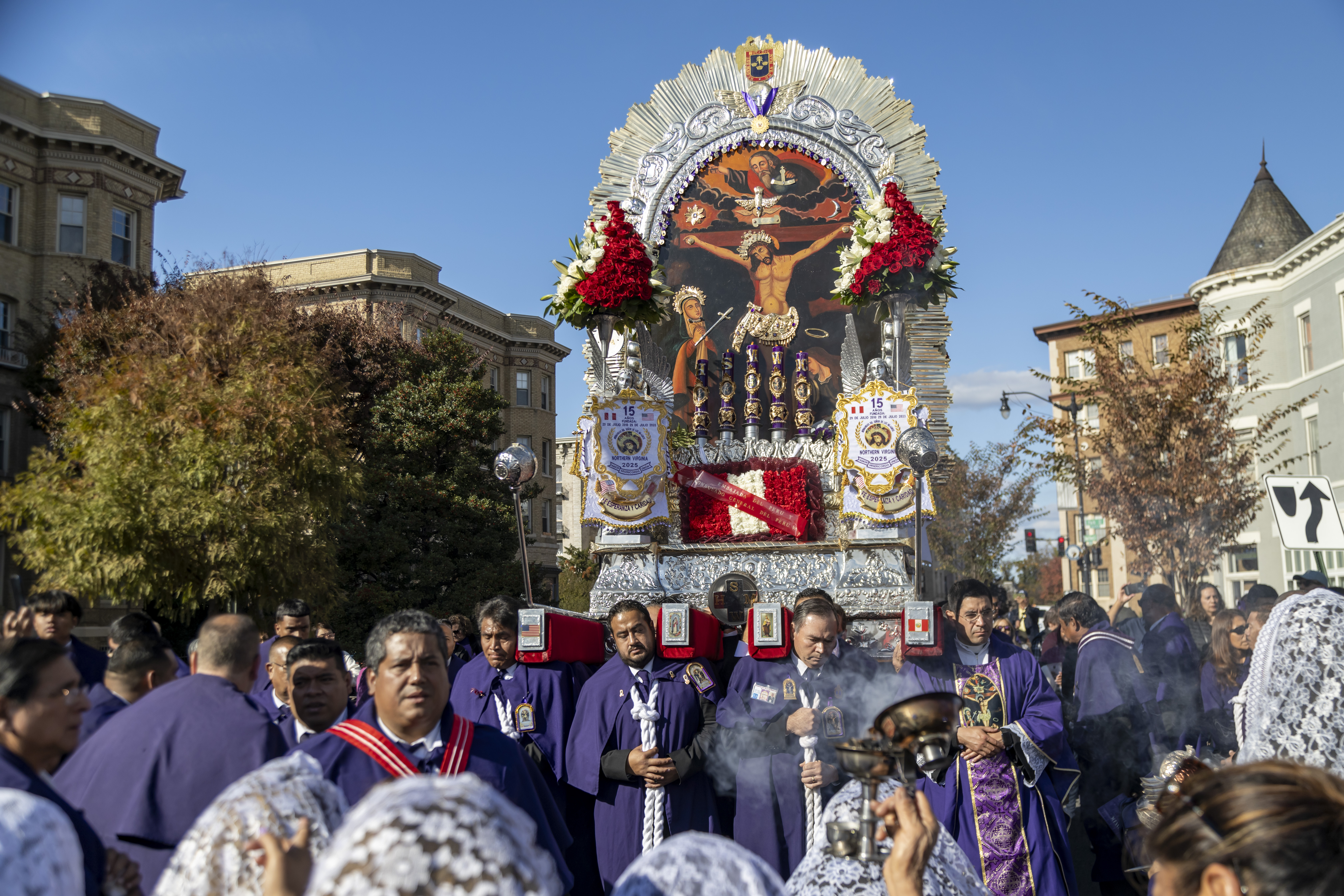 Tras la ceremonia religiosa, miles de devotos, muchos ataviados con el tradicional hábito morado, se unieron a la esperada procesión que recorrió las calles aledañas. La imponente anda fue cargada por miembros de las Hermandades del Señor de los Milagros de Washington D.C., con la participación activa de hermandades del área de Maryland y Virginia.