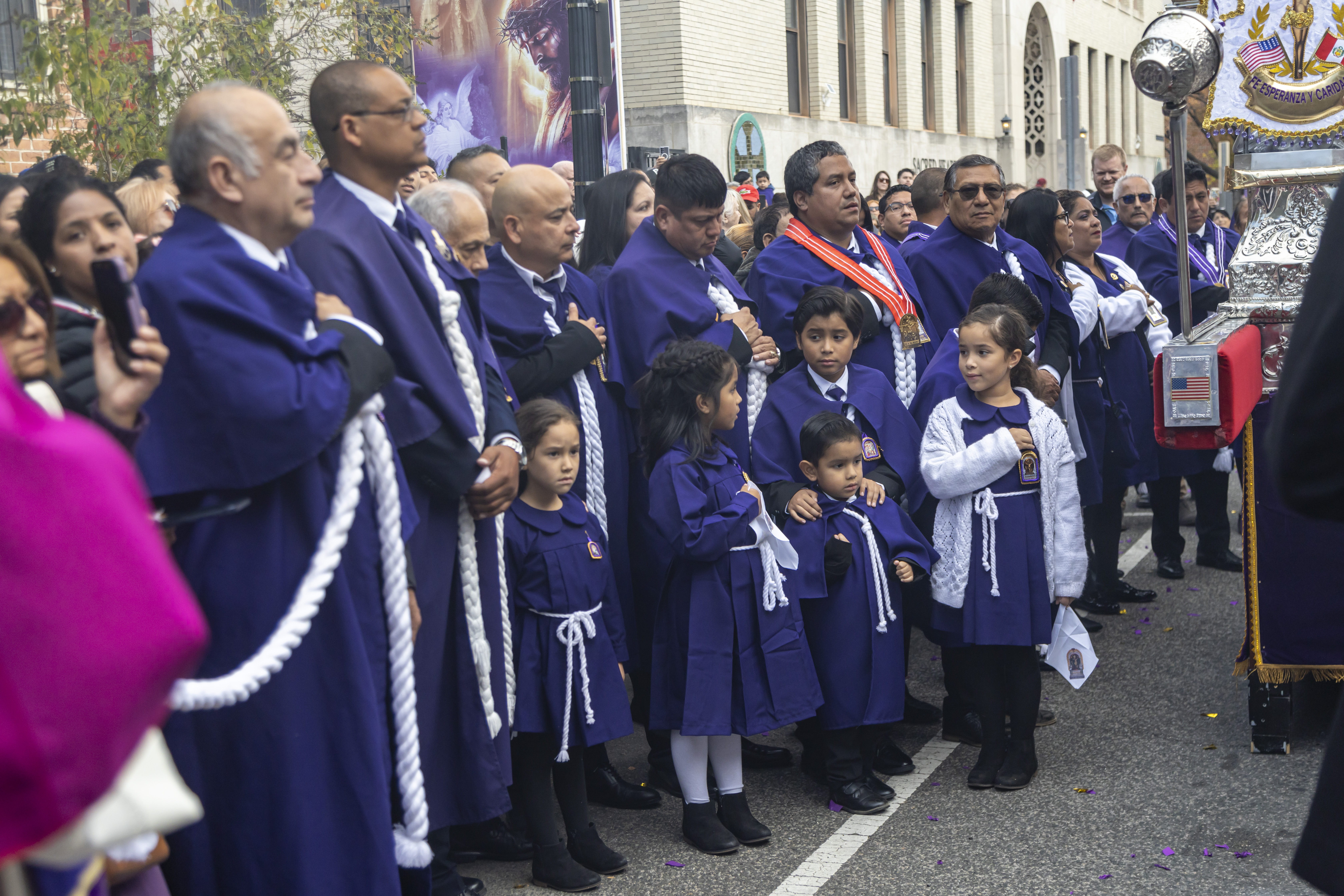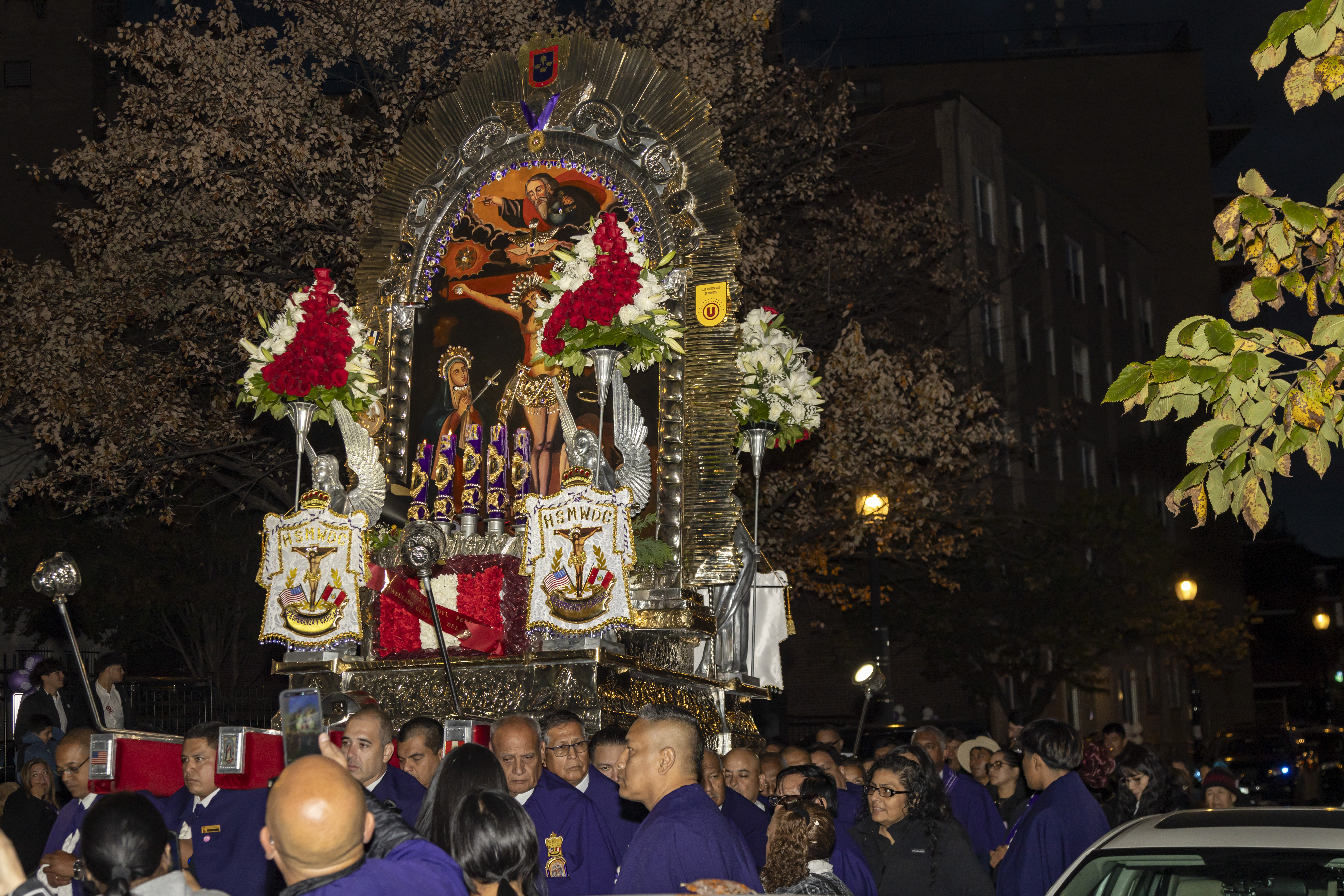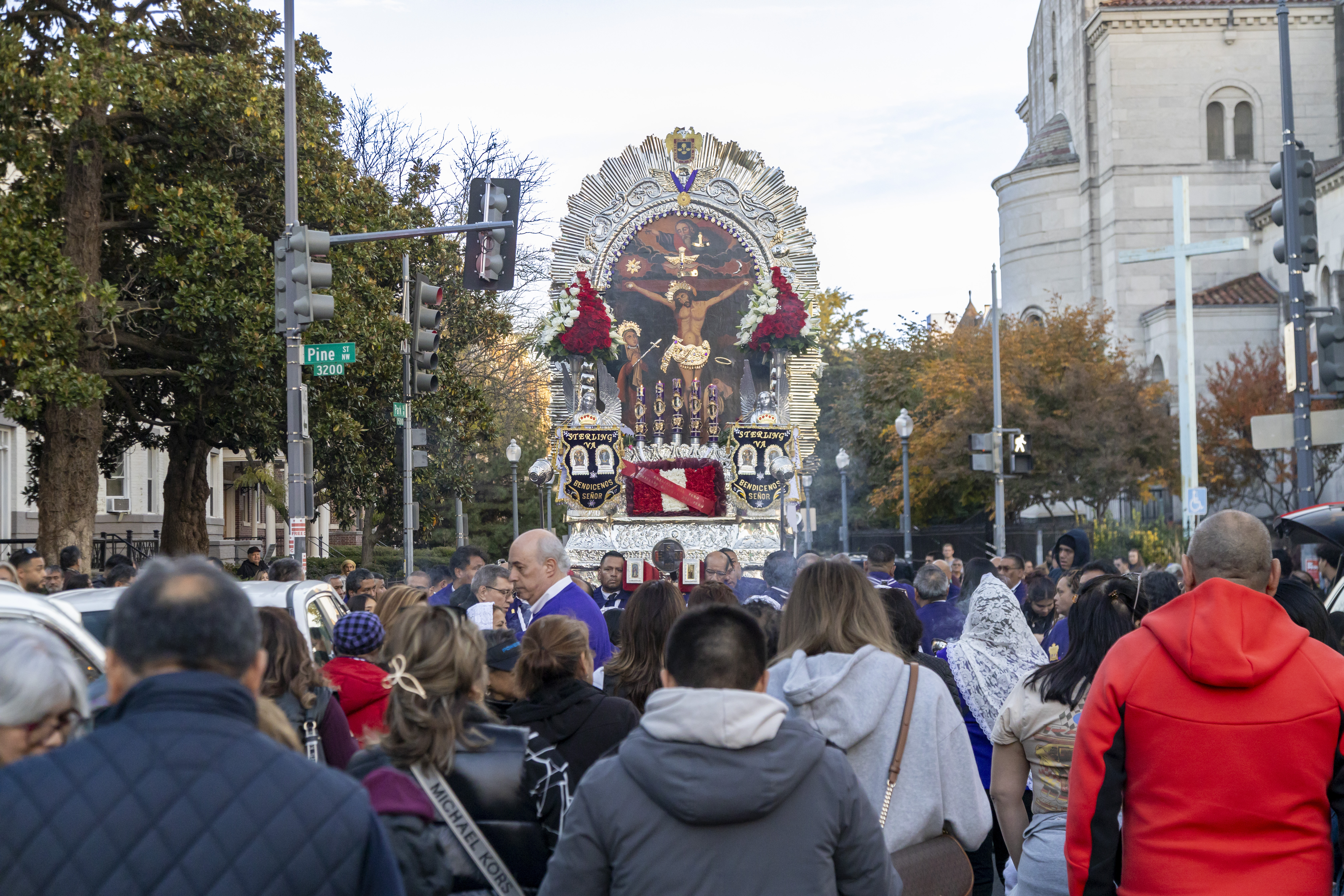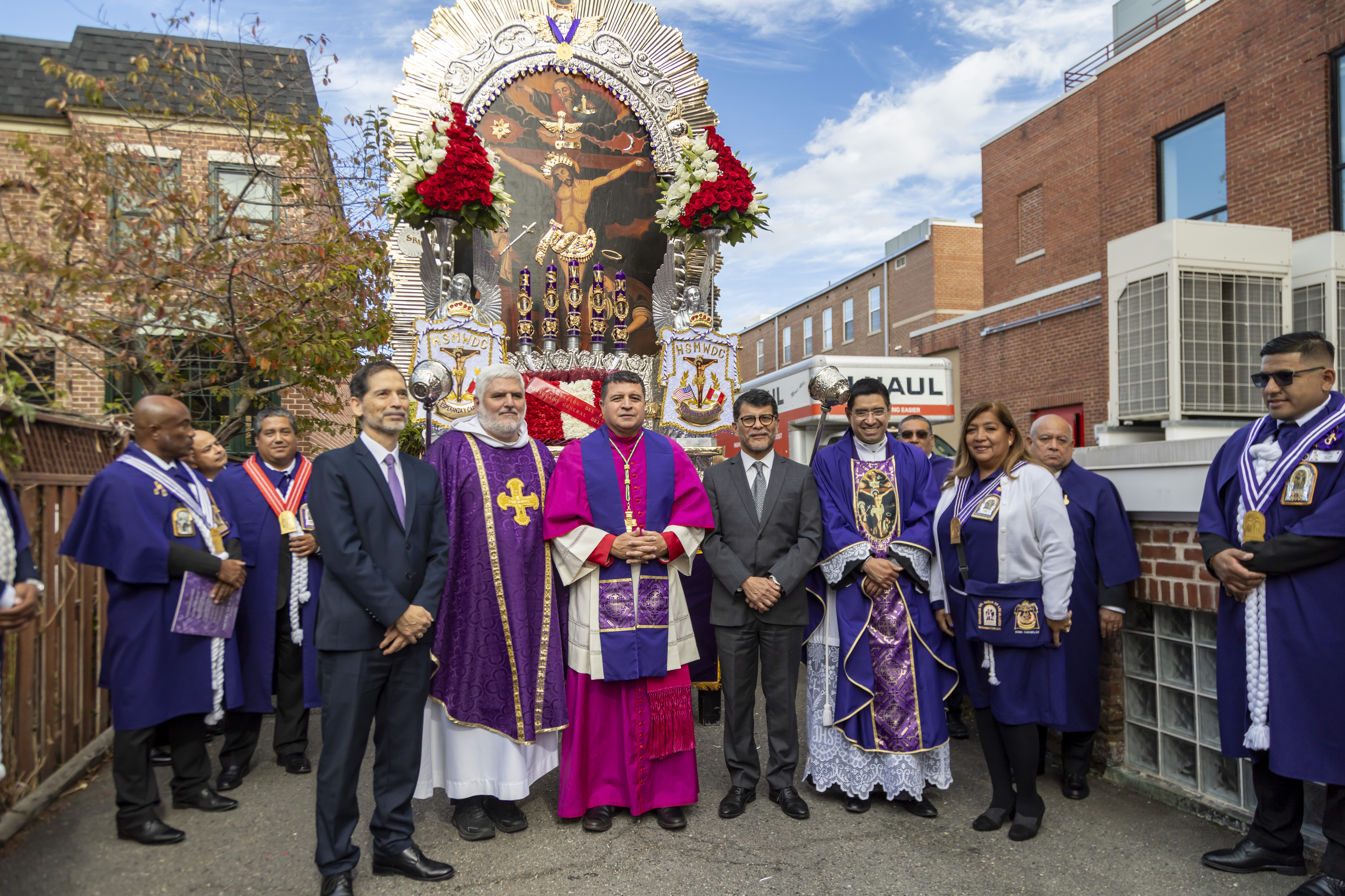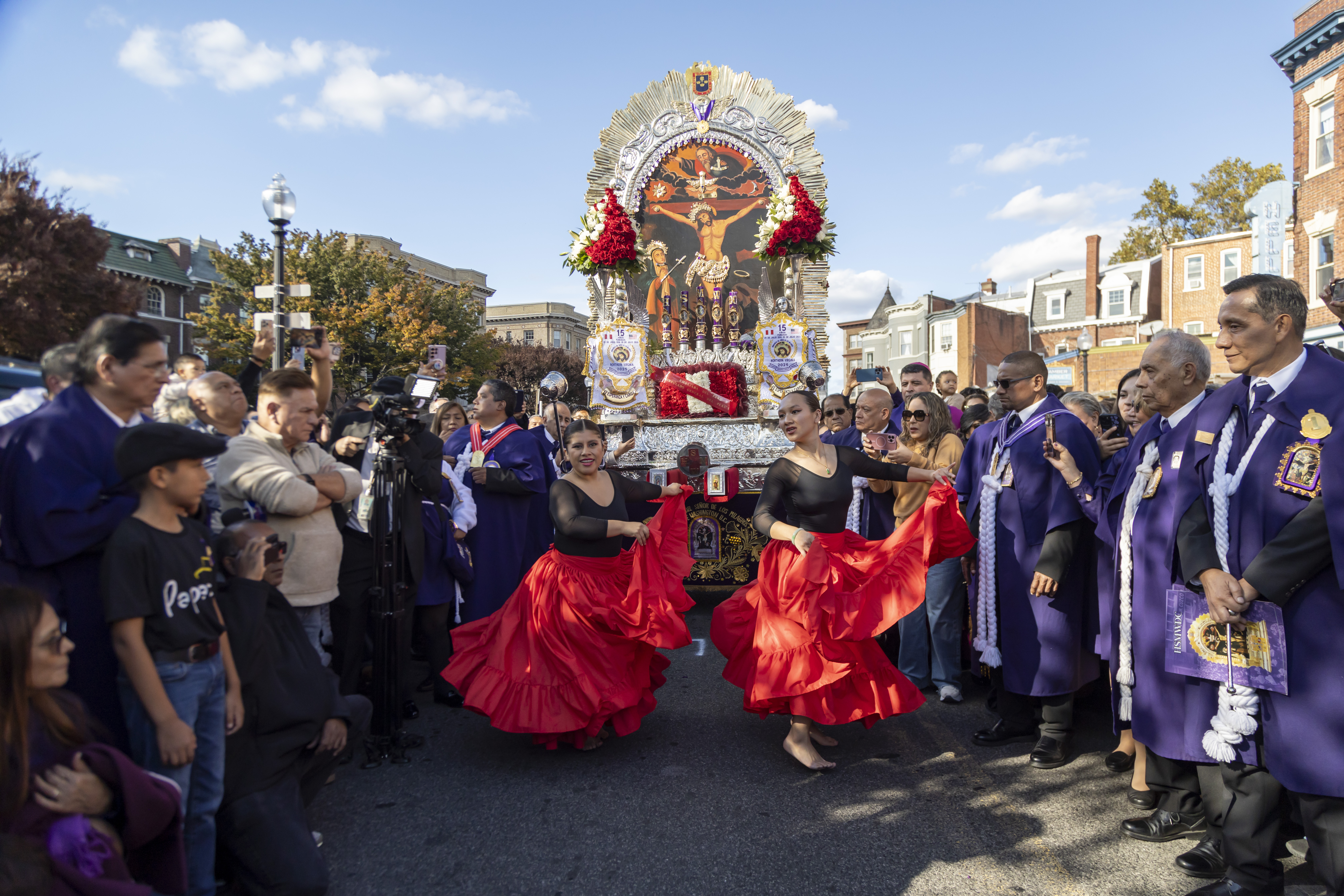 Tras la ceremonia religiosa, miles de devotos, muchos ataviados con el tradicional hábito morado, se unieron a la esperada procesión que recorrió las calles aledañas. La imponente anda fue cargada por miembros de las Hermandades del Señor de los Milagros de Washington D.C., con la participación activa de hermandades del área de Maryland y Virginia.